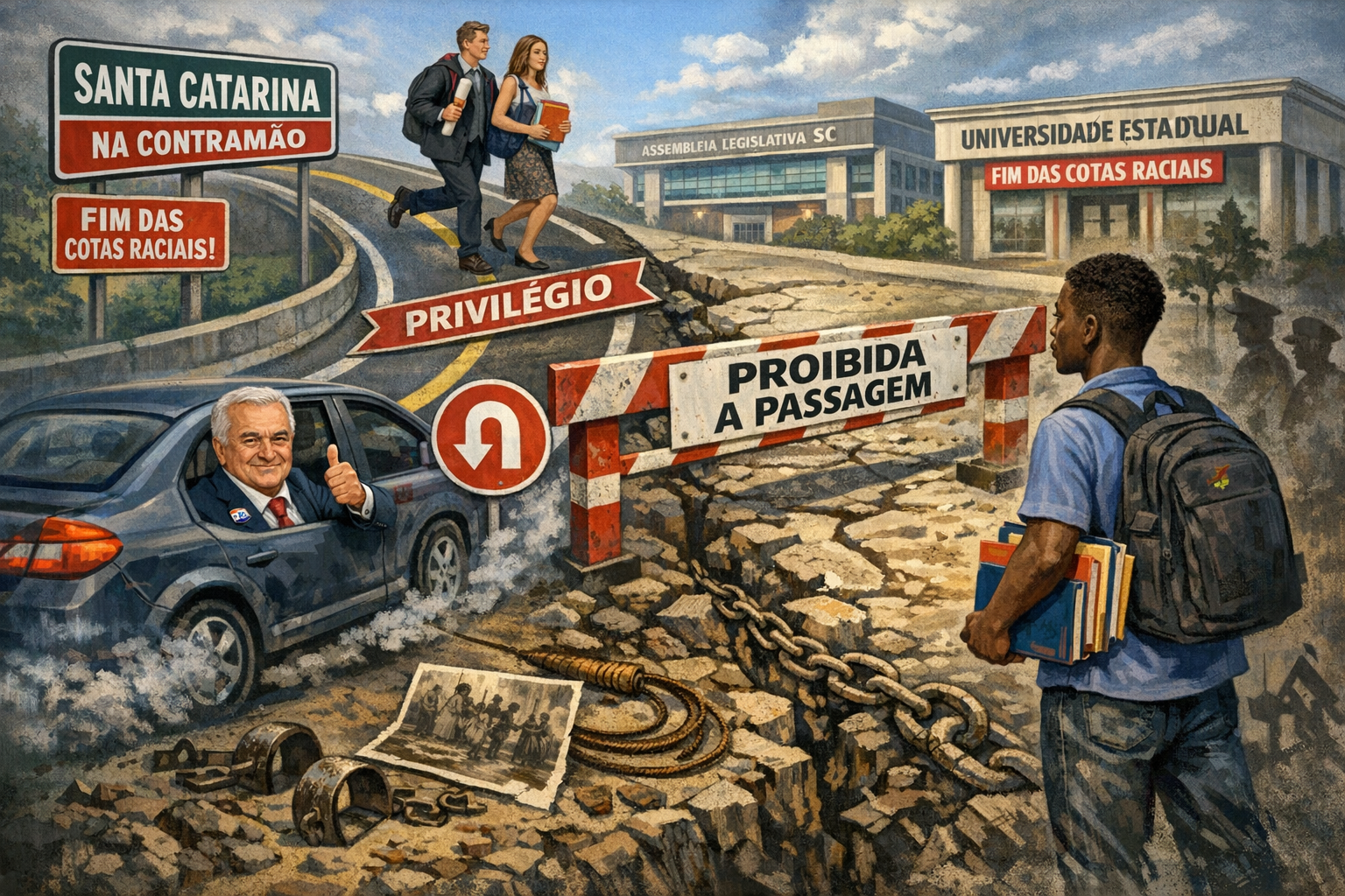 Nessa mesma semana, li sobre o fim das cotas raciais nas universidades estaduais de Santa Catarina. A Assembleia Legislativa aprovou um projeto de lei que proíbe cotas raciais e agora aguarda a sanção do governador Jorginho Mello (PL). Tudo muito civilizado, claro. Racismo, ali, foi tratado como assunto superado — provavelmente resolvido entre um cafezinho institucional e outro, no conforto de quem nunca precisou provar nada além do próprio sobrenome.