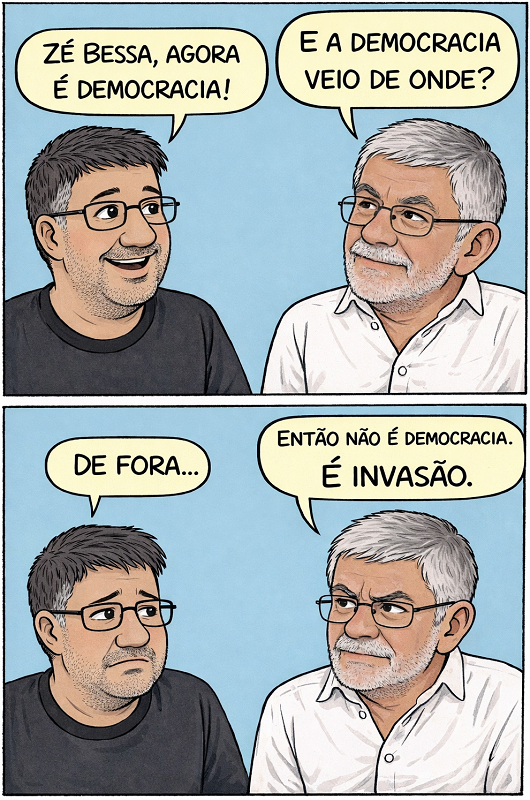 Há algo de profundamente perverso quando um tirano cai não pela força do povo que oprime, mas pelas mãos de forças estrangeiras que jamais tolerariam, em seu próprio território, aquilo que dizem defender fora dele. O povo deixa de ser sujeito histórico e vira figurante de uma geopolítica decidida em outra língua, outra moeda e outro fuso horário.
