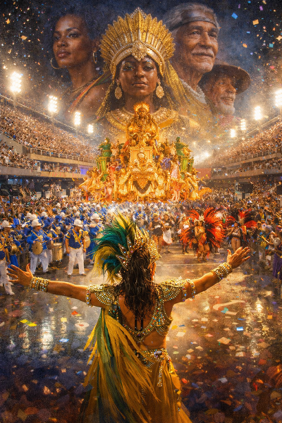 Nos desfiles, a história deixa de ser narrativa distante e se torna experiência sensível e tangível. O samba não apenas canta: argumenta. A alegoria não apenas enfeita: afirma. Por algumas horas, a avenida se converte em espaço simbólico onde identidade, memória e futuro caminham juntos diante de milhões de olhos.