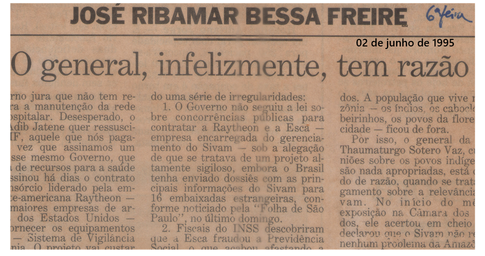 Por isso, o general da reserva Thaumaturgo Sotero Vaz, que comandou o Centro de Instrução de Guerra na Selva (CIGS) e cujas opiniões sobre os povos indígenas são preconceituosas, desinformadas e nada apropriadas, está carregado de razão neste caso, quando se trata de julgamento sobre a relevância do Sivam. No início do mês, em exposição na Câmara dos Deputados, ele acertou em cheio quando declarou que o Sivam não resolverá nenhum problema da Amazônia.